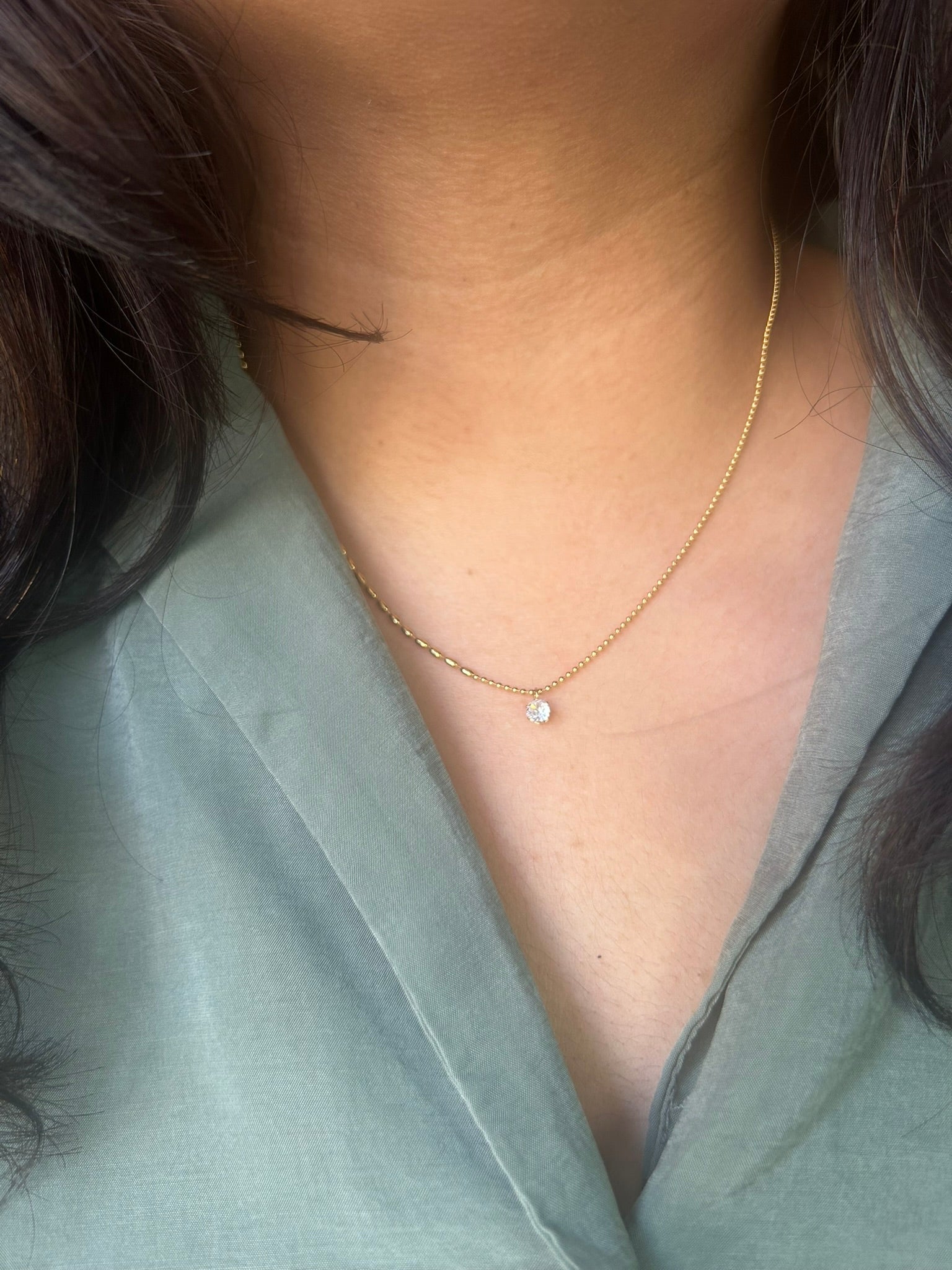 This piece features a delicate gold chain with a beautiful textural contrast: half of the chain showcases mini roundish links that give it a finely bead-like appearance, while the other half transitions into longer, more substantial beads. Suspended at the center is a dazzling mini zircon pendant, set in a classic four-prong setting.