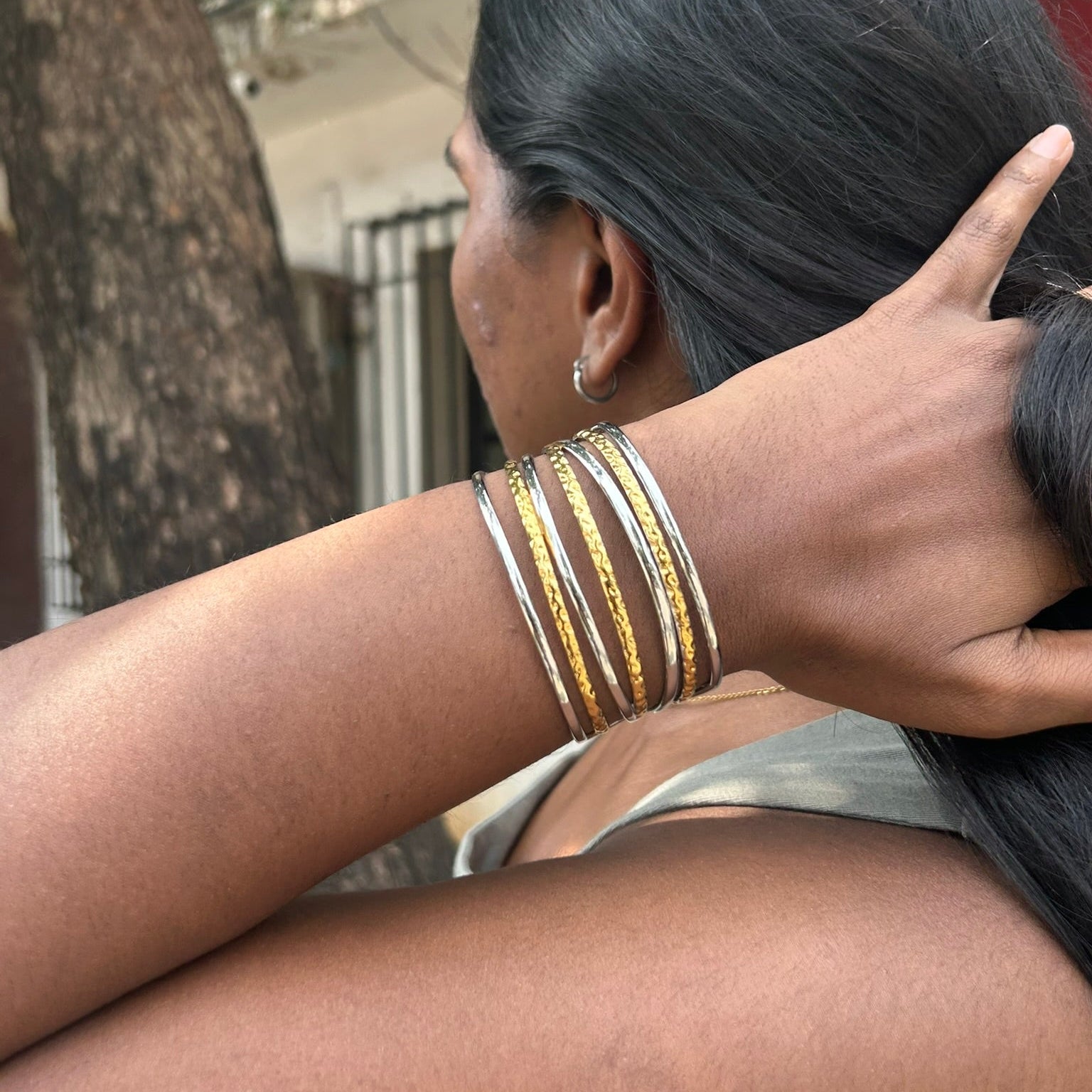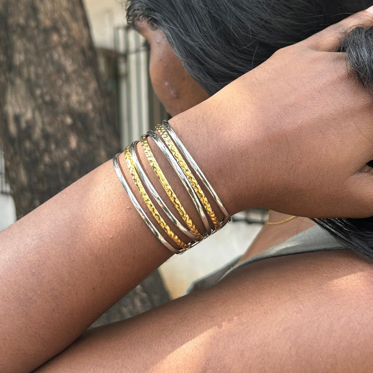 It showcases a sophisticated two-tone aesthetic, with the bands elegantly alternating between smooth silver-tone and richly 18k gold plated hammered texture. This mixed-metal look makes it incredibly versatile and easy to pair with any other jewellery in your collection.