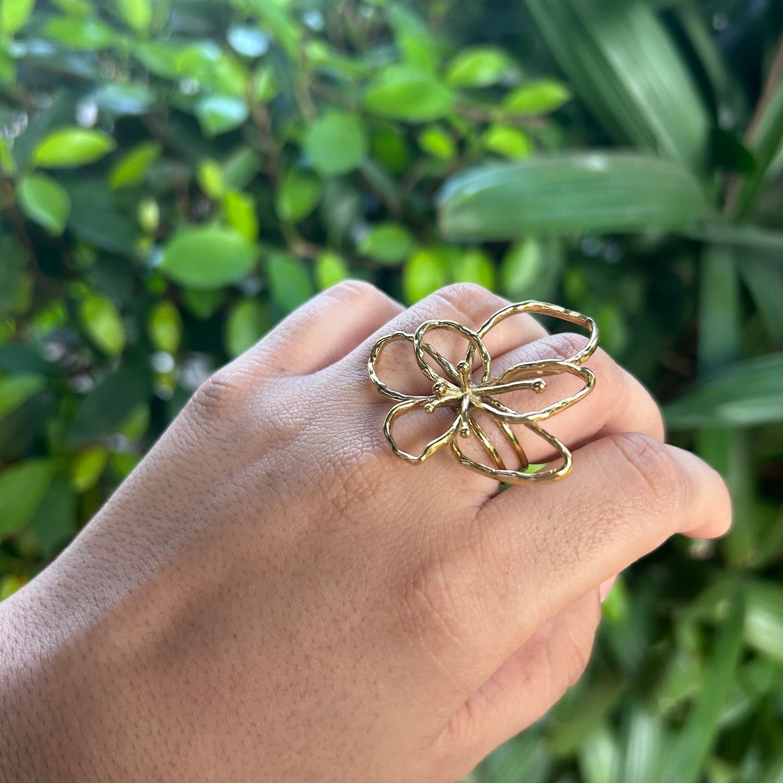 Make a striking, beautiful statement with the Floris Adjustable Ring. This piece captures attention with its big, expressive flower design, featuring artistic, flowing petals and a detailed center. It is a chunky yet elegant ring that adds an instantly attractive and feminine focal point to your look.