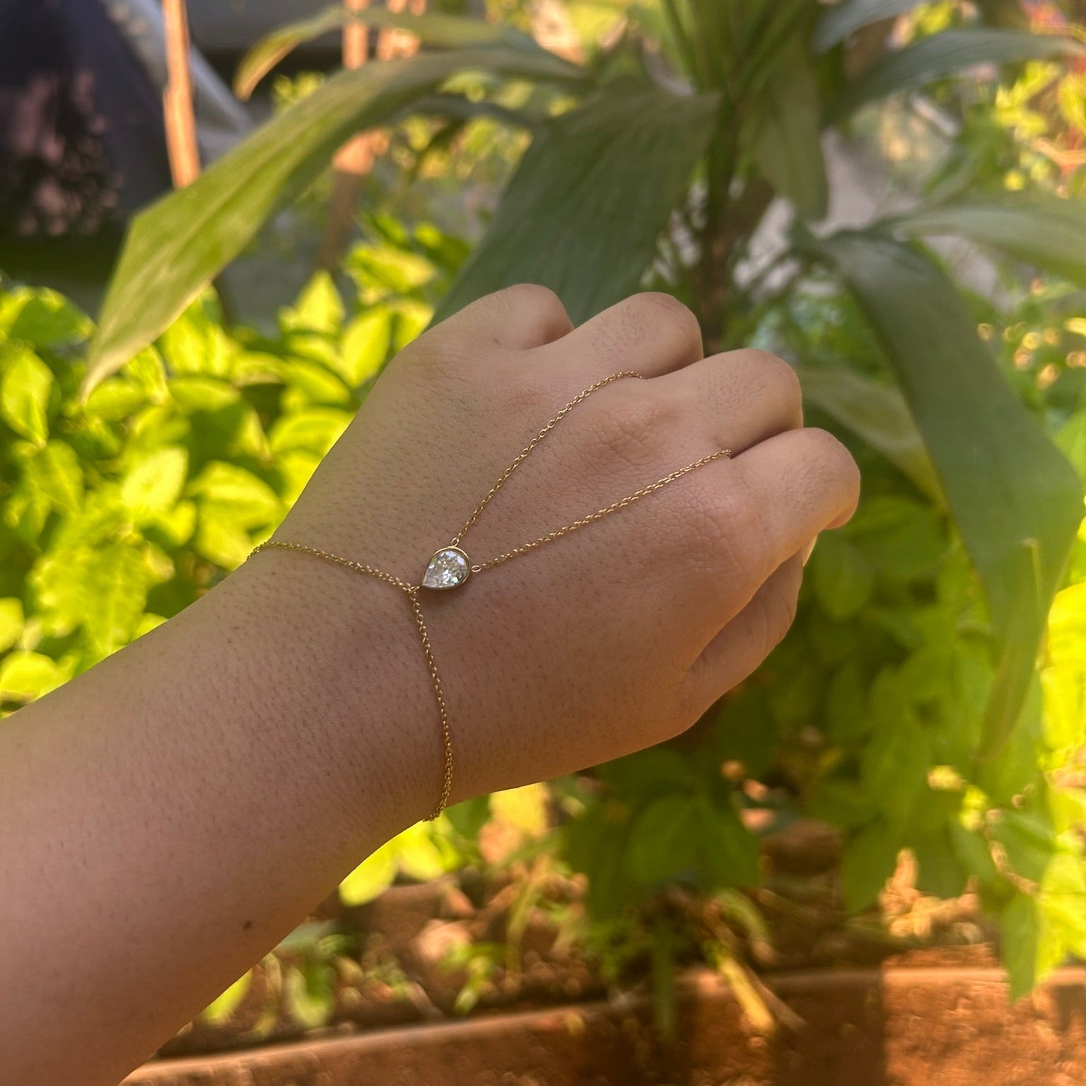 The centrepiece is a brilliant, bezel-set teardrop-shaped zircon that connects the two fine chains, creating a captivating flow of sparkle across your hand.
