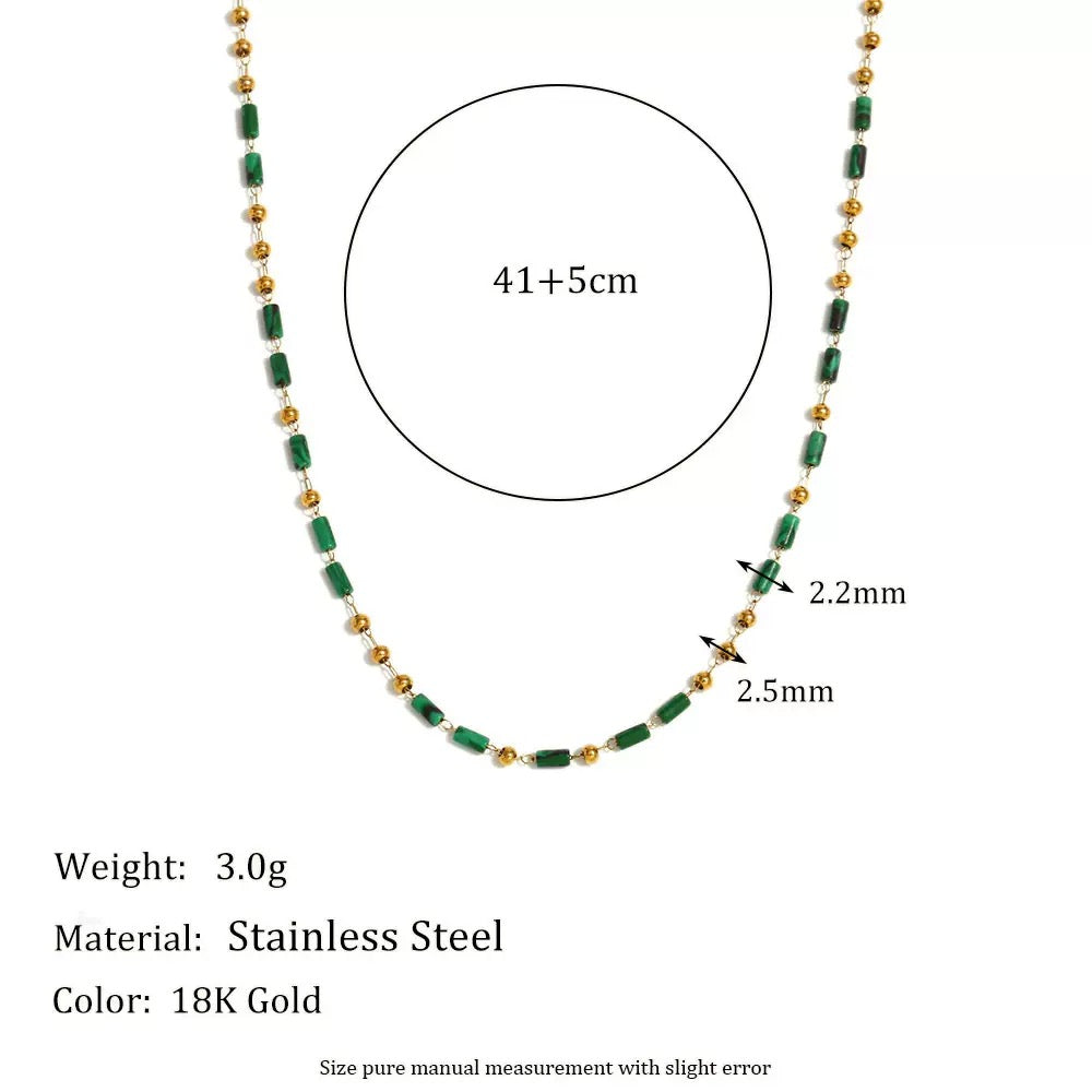 This piece features a delicate chain interspersed with two types of beads: dark green beads, alternating perfectly with round, polished gold beads in between. This arrangement creates a stunning, rich contrast between the lush green and the brilliant gold.