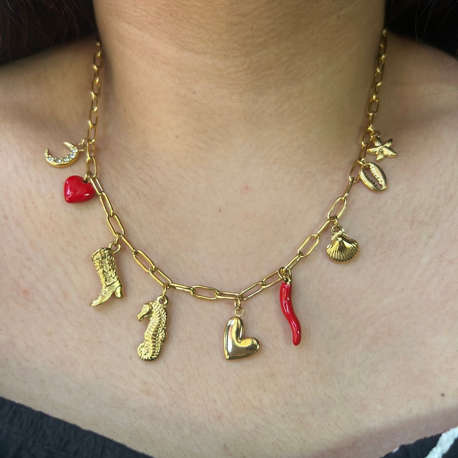 Charms: A curated mix of mini charms including a red enamel heart and chili, a seahorse, a cowboy boot, a crescent moon, and seashells.