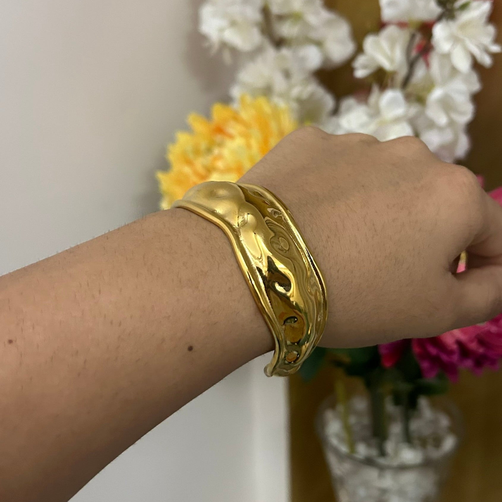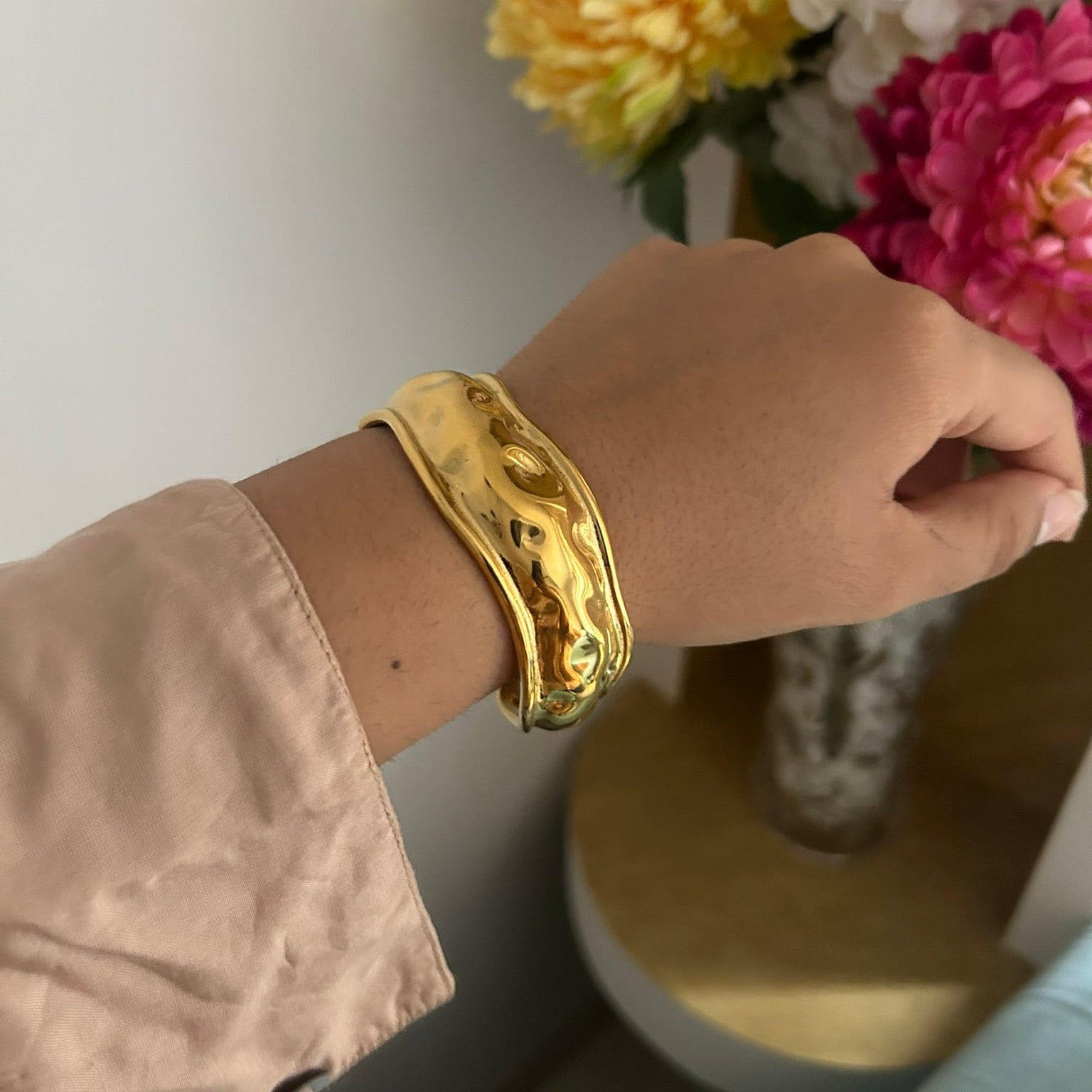 Embrace effortless modern luxury with the Maya Cuff Bracelet. This striking piece is defined by its bold, fluid shape and beautiful textured finish, giving it a distinctive, organic feel reminiscent of molten gold.