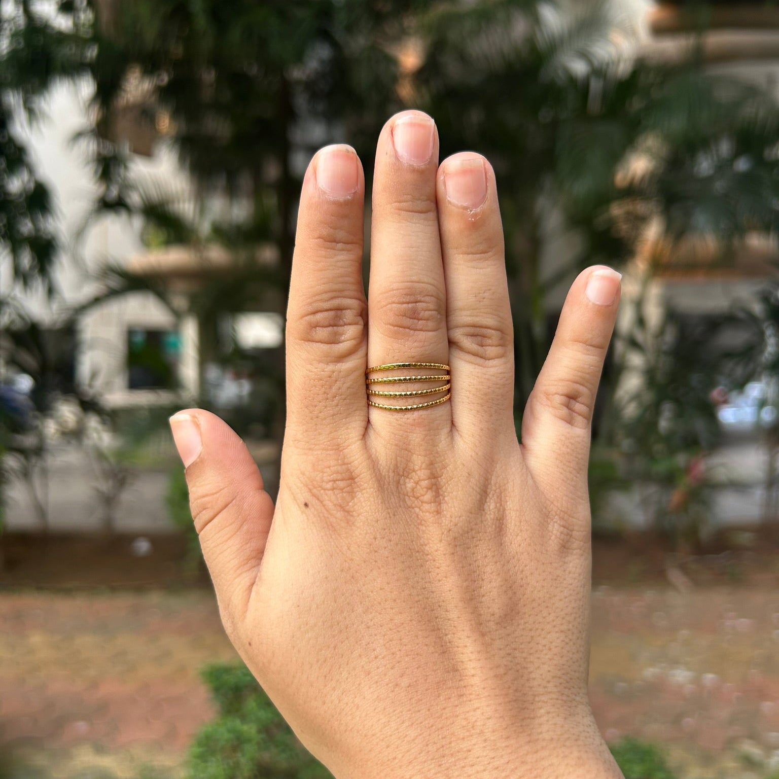 This unique design features four curved bands that are seamlessly connected in the back, yet appear as three distinct lines from the front. Each band is finished with a subtle, eye-catching hammered texture, adding depth and sparkle to this chunky statement piece.