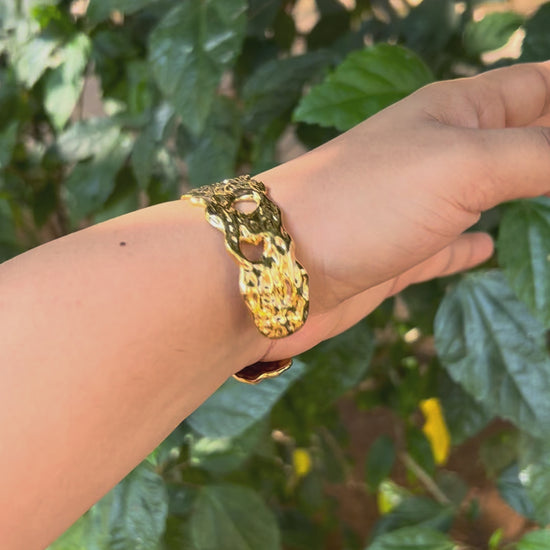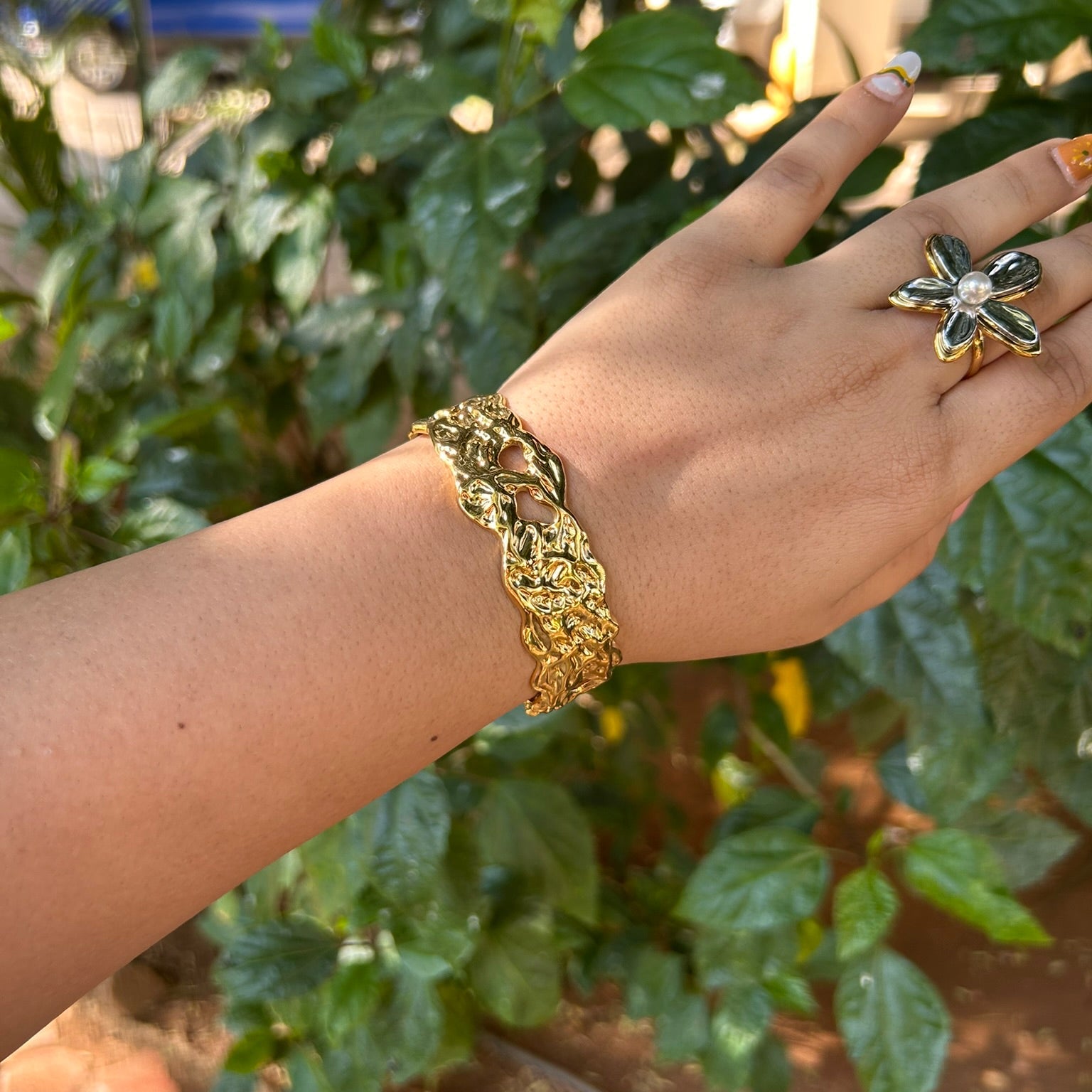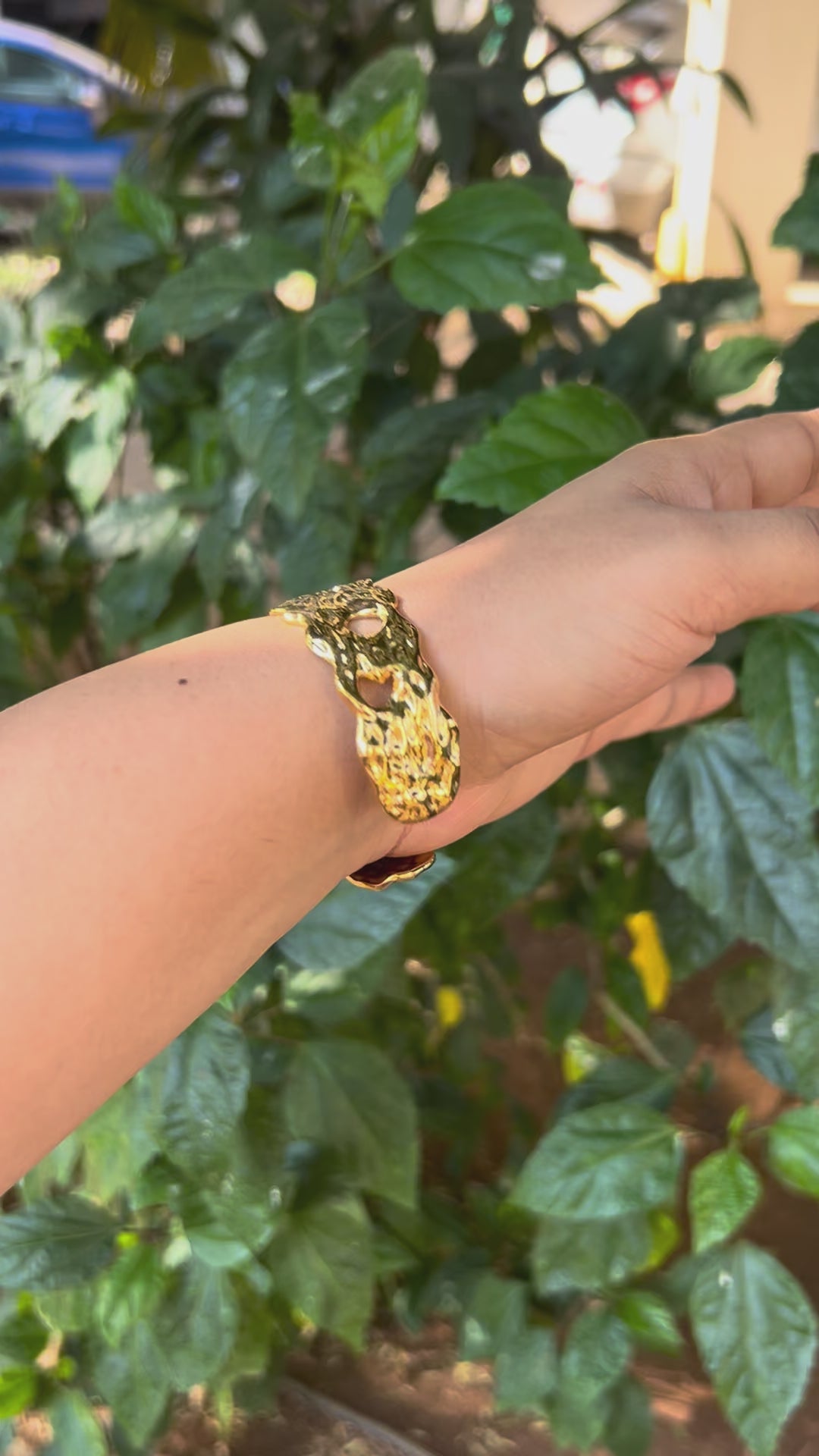 Design: An open-cuff silhouette with a textured, molten-metal finish and an eye-catching irregular opening at its centre.