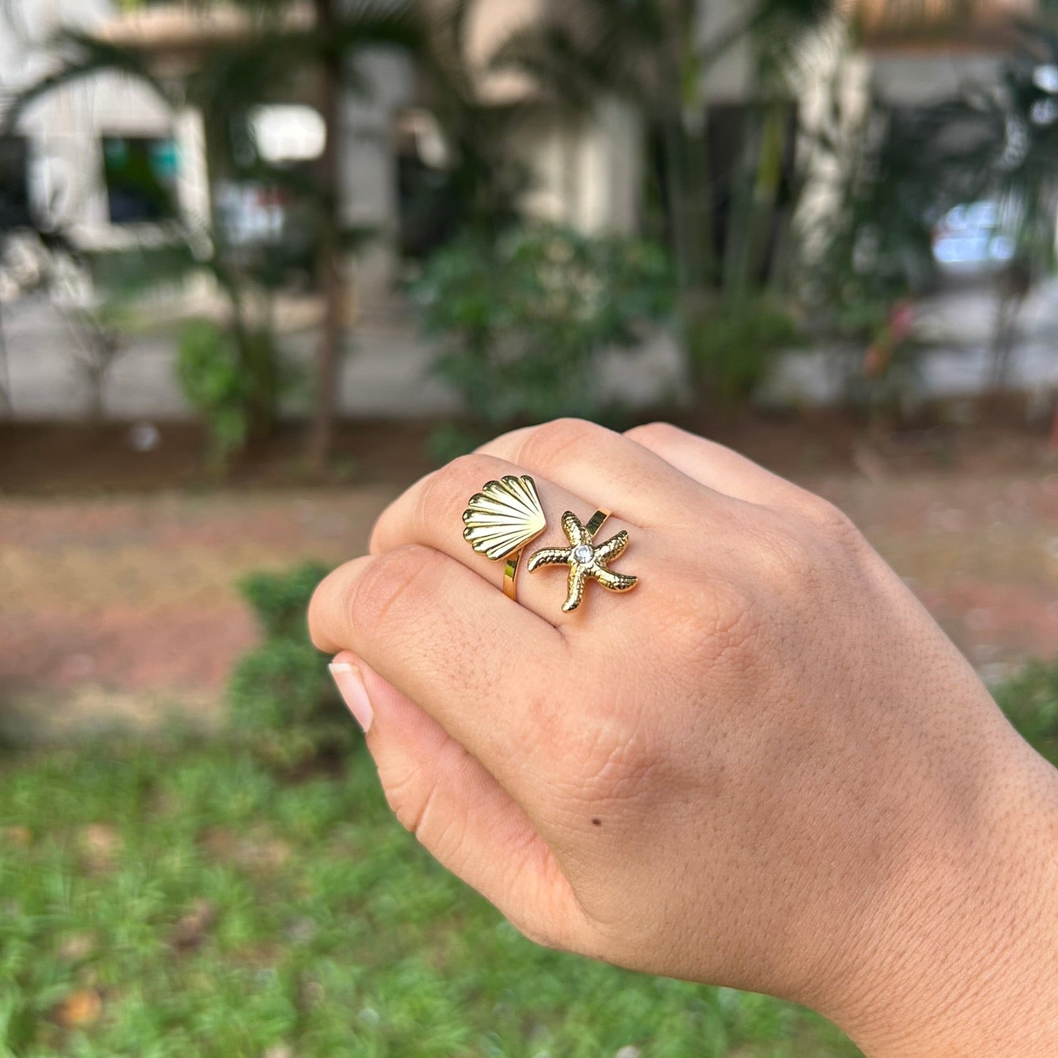 Bring the magic of the ocean to your hand with the unique Seastar Adjustable Ring. This charming piece features a statement open-style band, adorned with two contrasting seaside treasures: