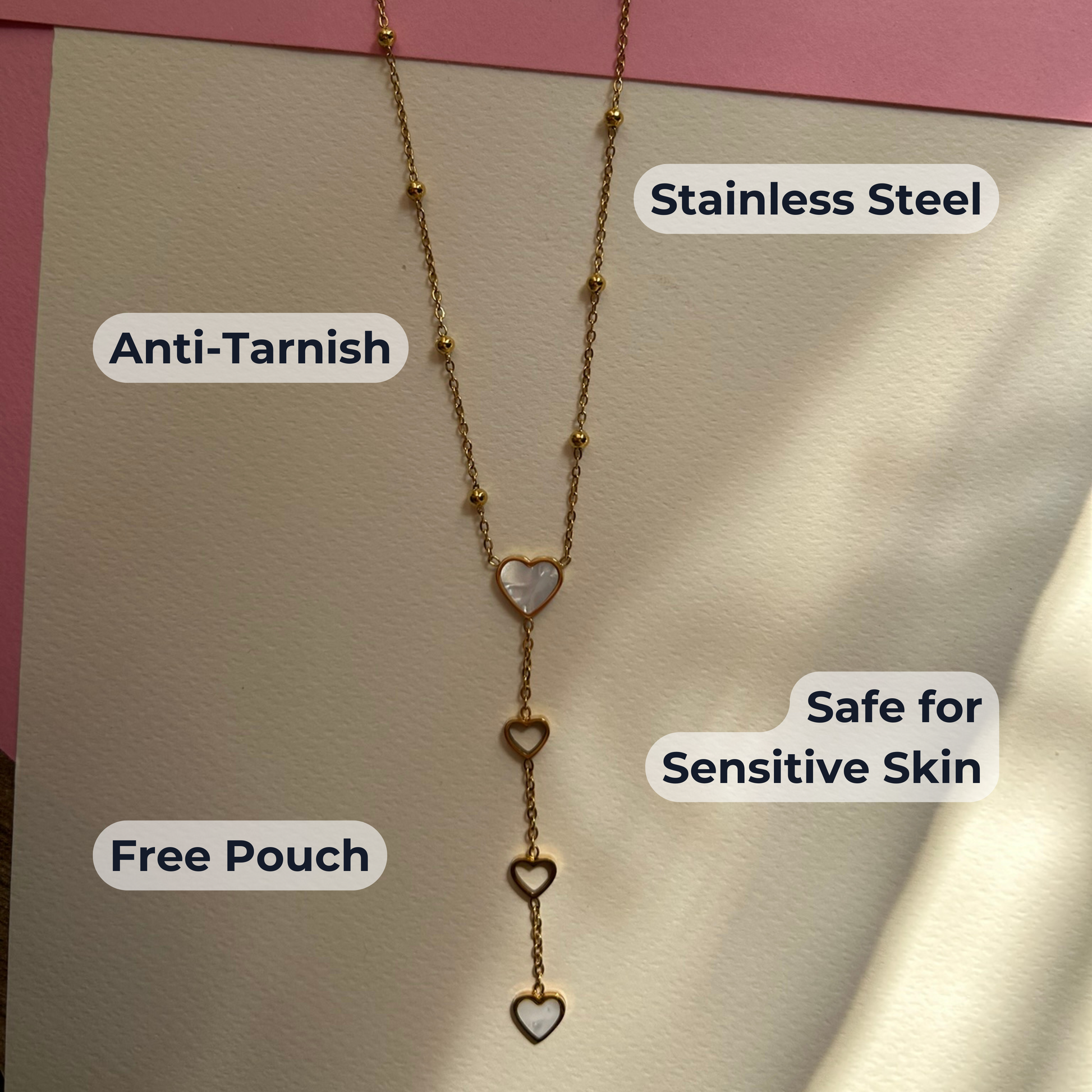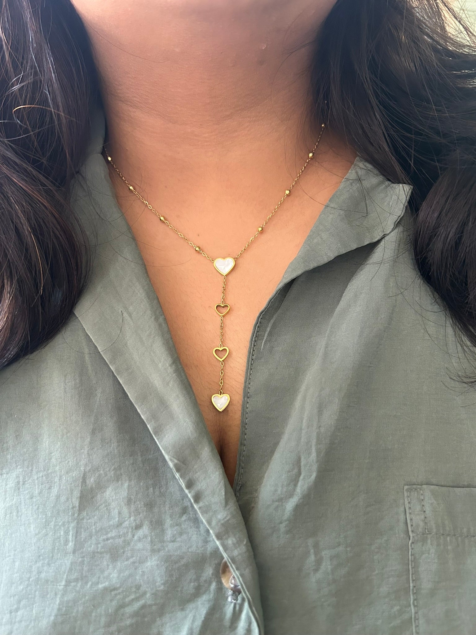 Featuring a playful arrangement of four hearts, the first and last hearts showcase a beautiful shell-like texture, while the two center hearts are adorned with shimmering golden rims.