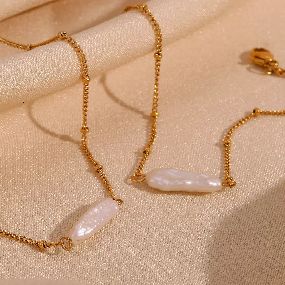 This piece features a beautifully textured chain with polished beads integrated at proper gaps, creating subtle visual interest along the entire length. The chain holds a unique, modern pendant: a smooth, rectangle pearl with curvy edges set horizontally in the center.
